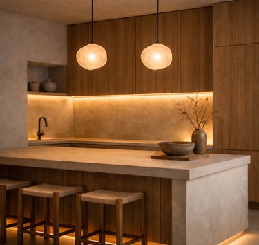 Iluminación precisa para trabajar y más cálida cuando la cocina se convierte en un espacio para compartir.