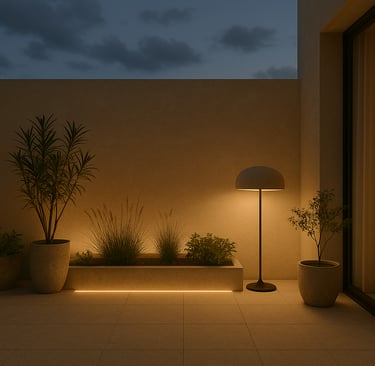 La iluminación define el espacio al anochecer. Marca recorridos y zonas con discreción y equilibrio.